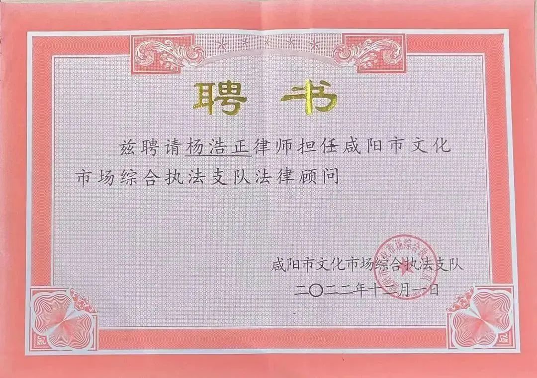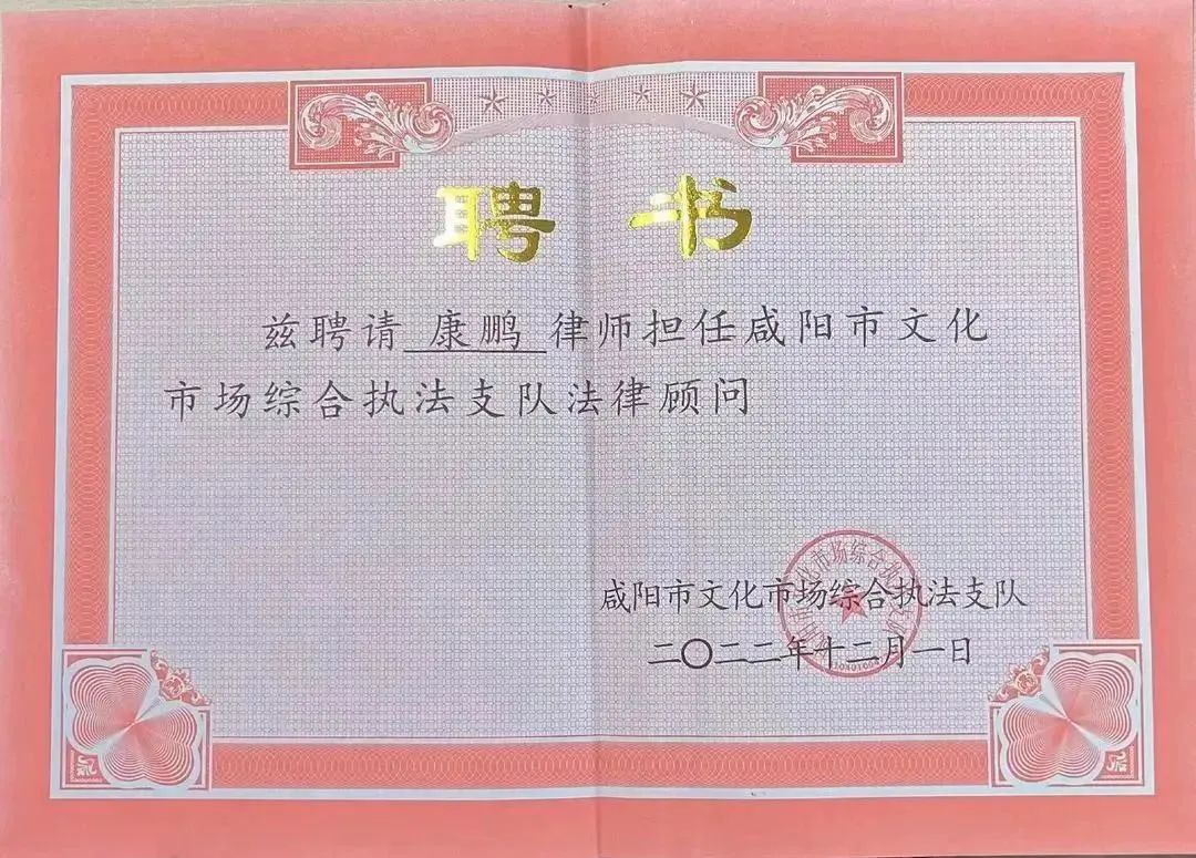 为深入贯彻落实中央全面推进依法治国精神,建立健全政府法律顾问制度,近日,咸阳市文化市场综合执法支队向本所康鹏主任、杨浩正律师颁发聘书,聘请我所康鹏主任、杨浩正律师为法律顾问,为其提供法律服务。两位律师表示:此次有幸受聘深感责任重大,定会认真履职,不负所托,用专业的法律知识与精湛的业务能力回馈信任。