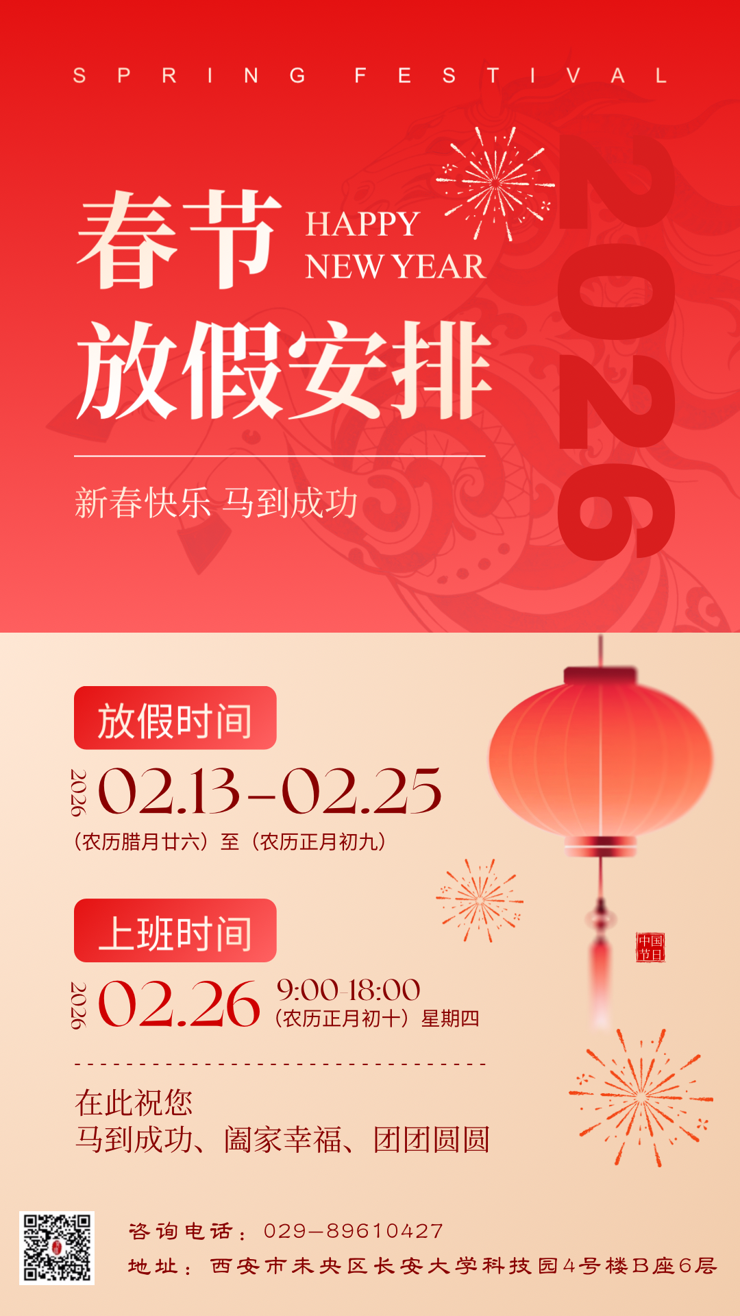 尊敬的各位客户、各位同事: 律转鸿钧佳气同,肩摩毂击乐融融。新春佳节将至,根据《国务院办公厅关于2026年节假日安排的通知》,并结合我所的实际情况,现将陕西其源律所2026年春节放假安排如下: 一、放假时间: 2月13日(星期五 )至2月25日(星期三),共计13天。 二、上班时间: 2026年2月26日(正月初十 星期四)上班,2月28日(星期六)补班 三、注意事项 1、放假前,请大家做好防火、防盗工作,注意检查相关设施设备,确认电源和门窗关闭后再离所。 2、回家或外出旅游路上,大家须注意好人身财产安全,提前做好返程安排。 3、春节放假期间,如您有法律问题或紧急情况处理,请致电相关承办律师协调工作,我们将积极配合各项事宜。 值此马年新春到来之际,陕西其源律师事务所全体同仁衷心感谢您长期以来的信任与支持,并向您致以最诚挚的节日问候与祝福!预祝您在新的一年里龙马精神、财源广进、阖家欢乐、万事如意!